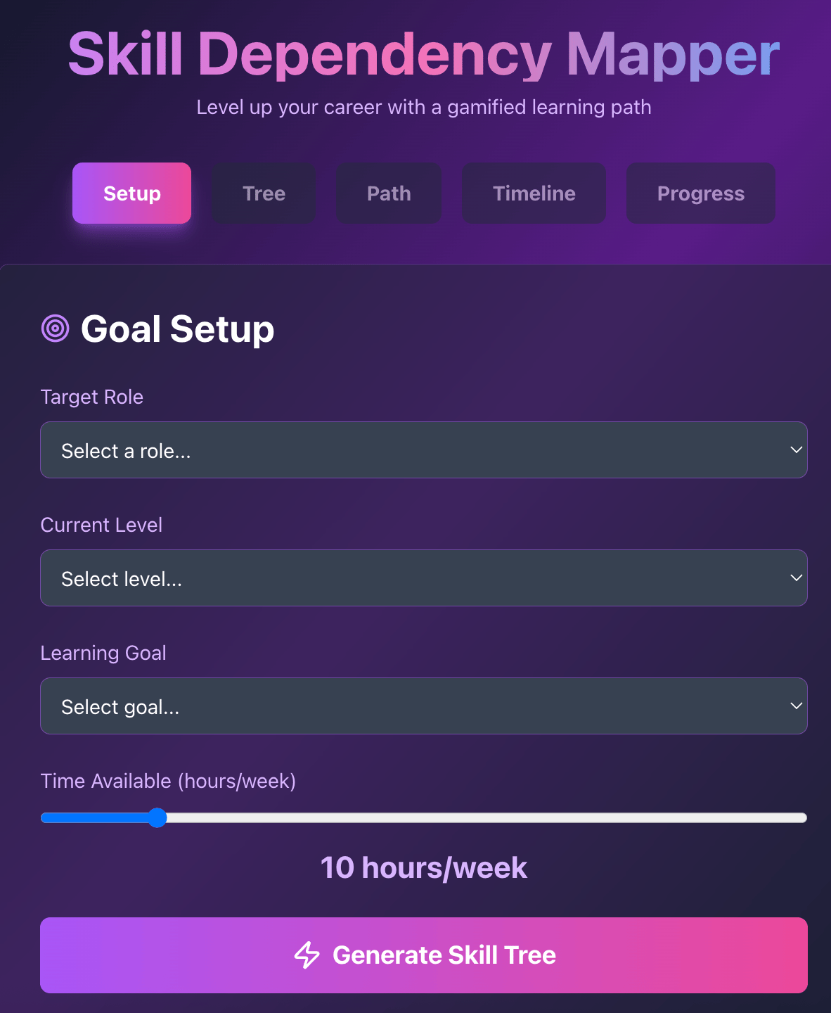 When I click "Search Learning Resources" or "Find Skill Guides," use web search to find current courses, tutorials, practice platforms, and community-recommended learning paths for specific skills.What this does: Transforms overwhelming skill acquisition into a clear progression path—showing exactly what to learn first, what unlocks next, and how long it realistically takes, with gamification making the long journey feel like leveling up in a game.