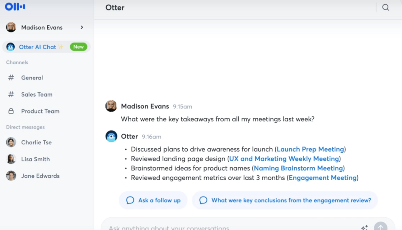 Otter.ai is an AI-powered meeting assistant that automatically records, transcribes, and summarizes conversations in real-time. It serves as a comprehensive note-taking solution that eliminates the need for manual note-taking during meetings, allowing participants to focus on the discussion. And don’t forget the newest feature allowing users to ask questions in natural language, not unlike NotebookLM’s new interactive podcast function.