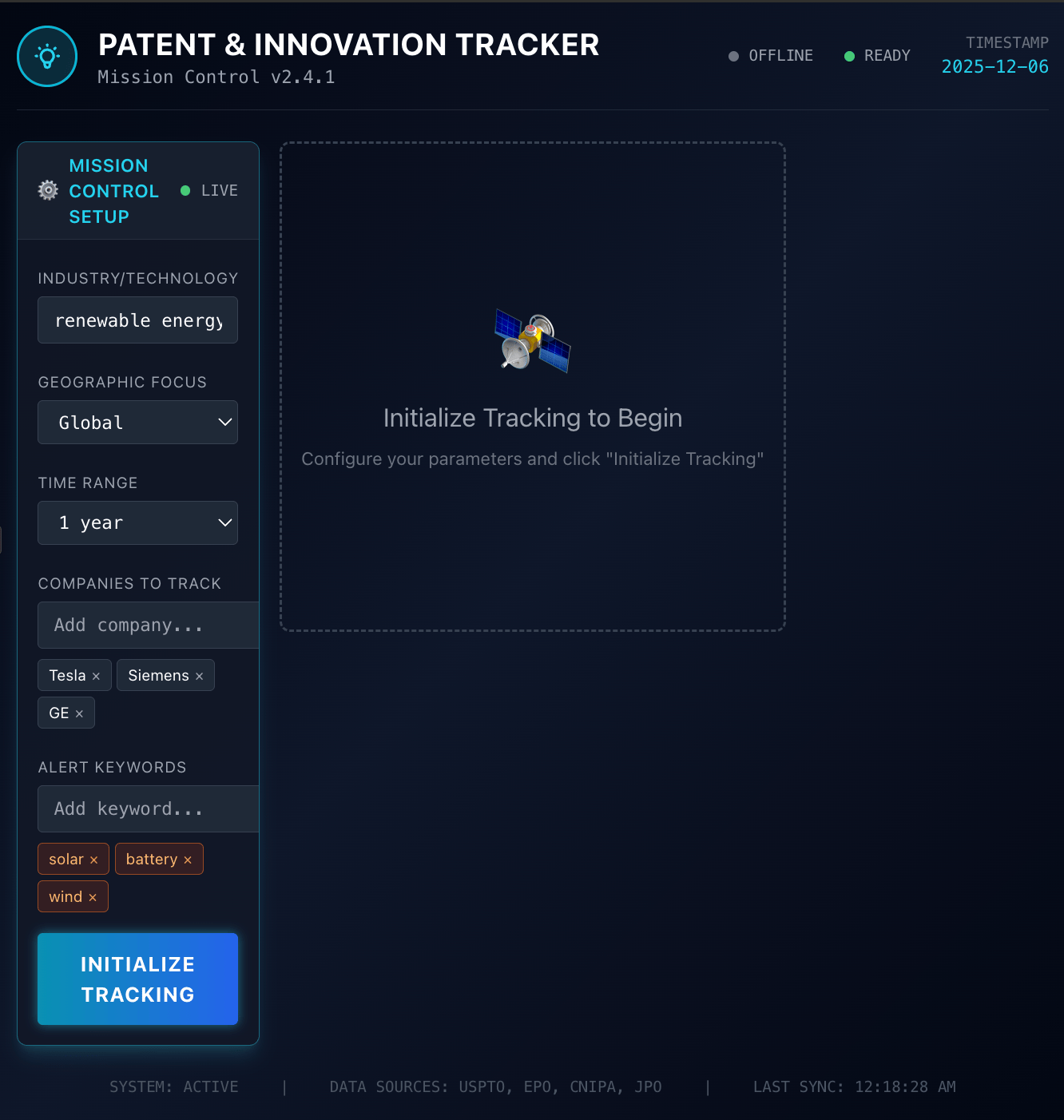 When I click "Refresh Data" or "Search for White Space," use web search to find recent patent filings, technology news, innovation reports, and market analysis for the specified industry.What this does: Creates a command center for tracking patent activity and innovation trends—helping investors spot emerging technologies, companies identify white space opportunities, and strategists understand where competitors are placing their R&D bets.